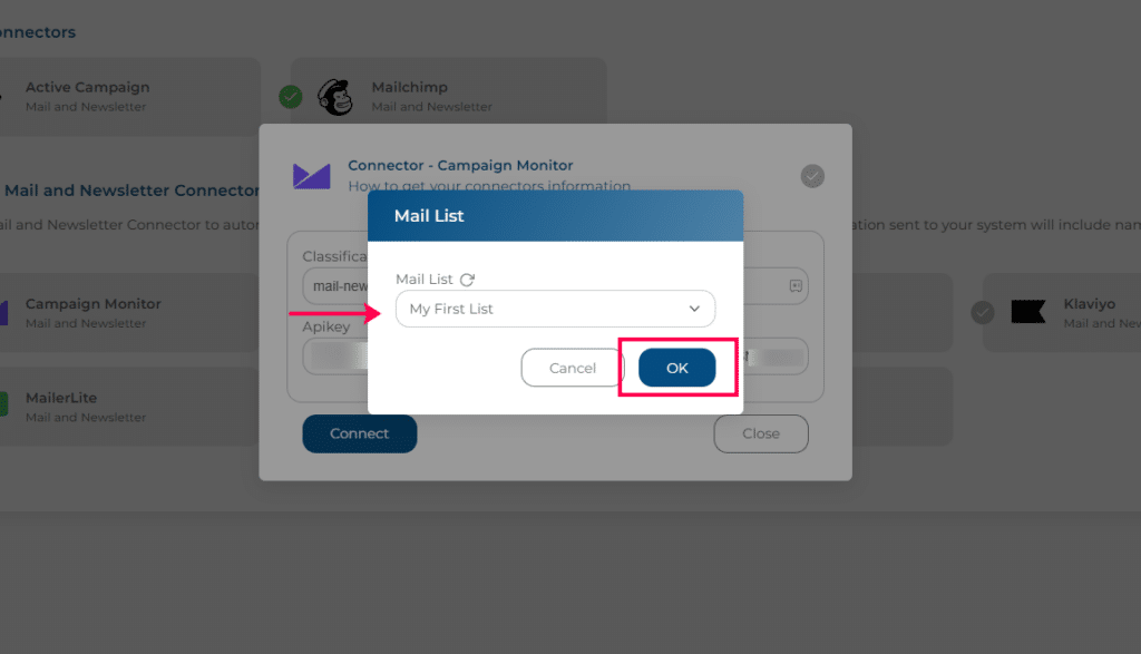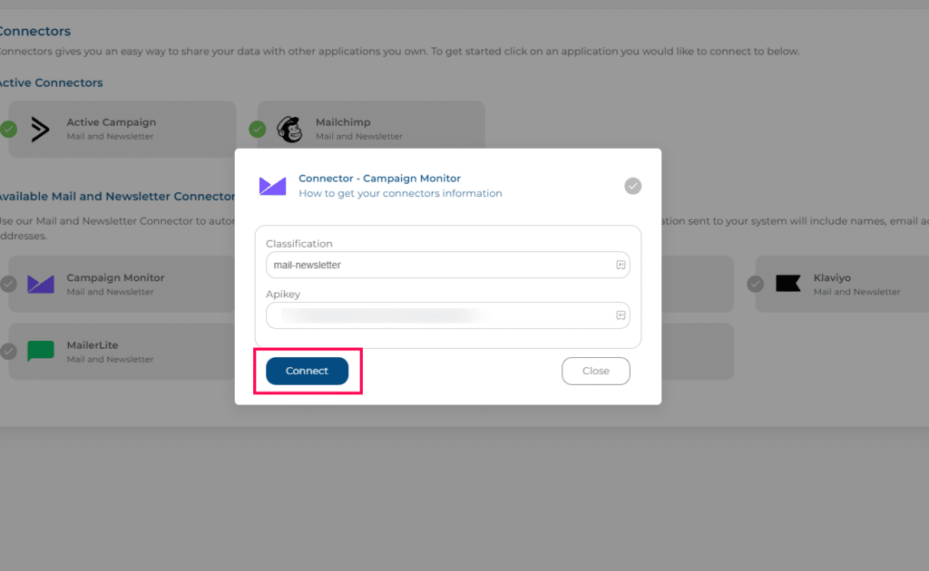 After selecting Campaign Monitor, it will ask you to fill in your Apikey. If you are unsure of where to find that code, click here. Campaign Monitor has an easy article to guide you through it. You can also select “How to get your connectors information” from the connector page. All the connectors have this option to show you how to find what you need from each individual site.